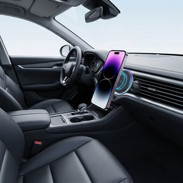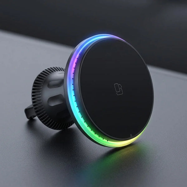 Découvrez le chargeur magnétique 30W qui transforme votre habitacle. Votre iPhone (12-15 Pro Max) est solidement maintenu et rechargé à vitesse maximale. L'anneau LED RGB intégré crée une ambiance unique, alliant performance et élégance moderne.